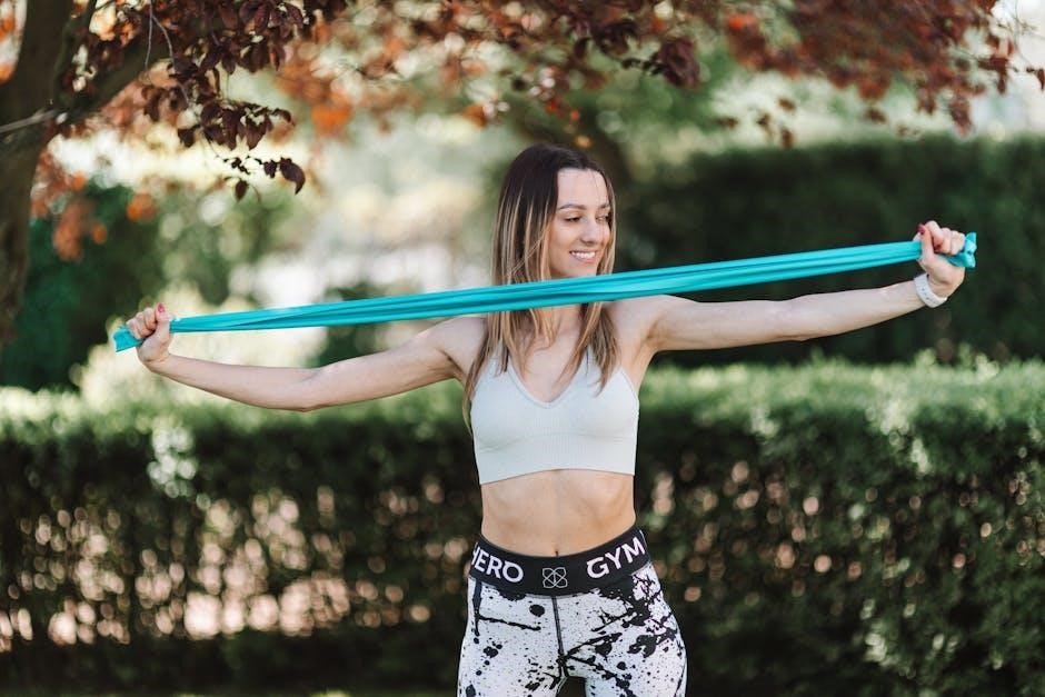 These PDFs commonly feature exercises like band lateral raises, front raises, and external rotations. Instructions emphasize controlled movements and proper form to avoid injury, often including visual demonstrations. Montana State University’s workout PDFs may incorporate band work into broader shoulder routines.